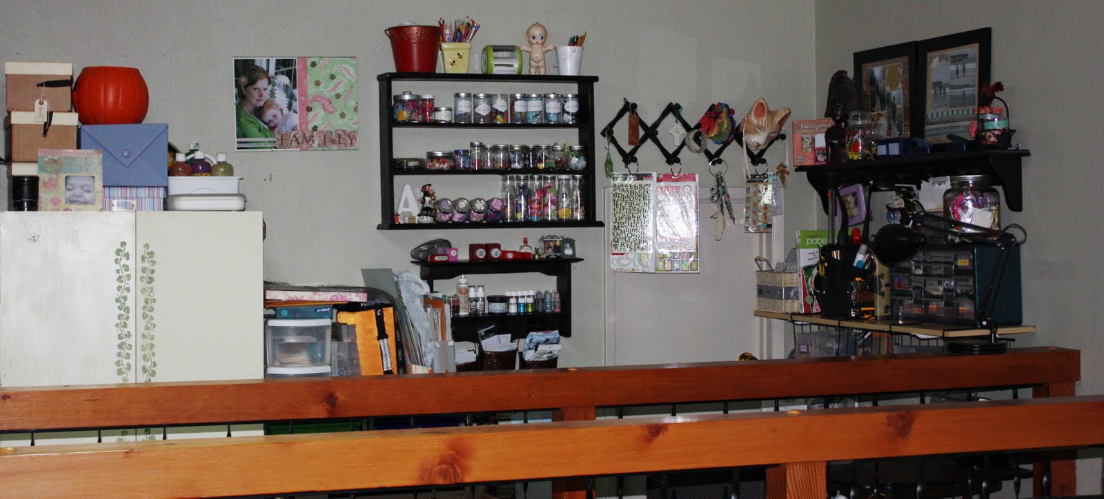 Even though I have a tiny space, it has the feel of a bigger space because it looks out into the family room. I can watch TV & keep an eye on the kids while I am scrapping.